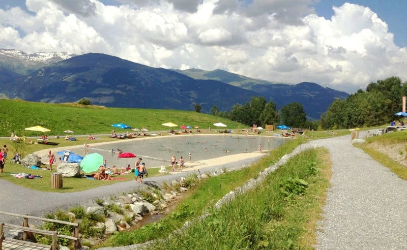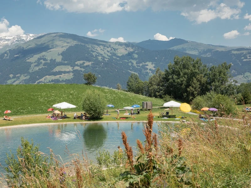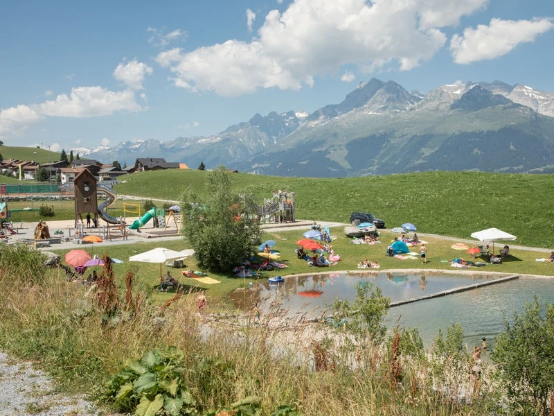 Der Aussenbereich mit Badesee, Kinderspielplatz, Beachvolleyballfeld ist vor allem im Sommer sehr beliebt.