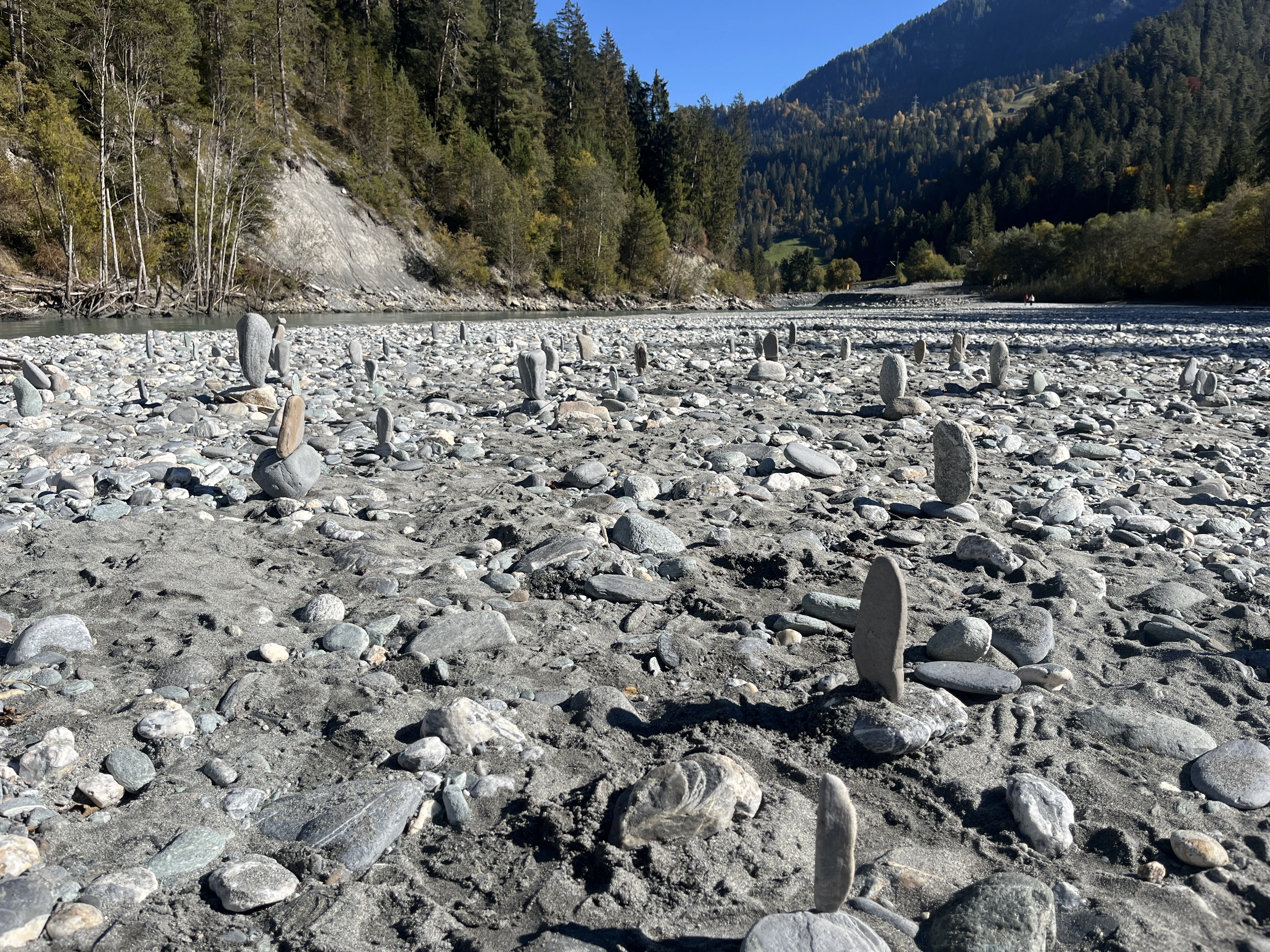 Die Zeit nach dem Mittagessen nutzen wir je nach persönlichen Vorlieben für den wohlverdienten Mittagsschlaf, für eine weitere Mineralienanalyse oder aber für etwas Land Art - denn auch dafür eignen sich die vielfältigen Gesteine welche der Vorderrhein transportiert.