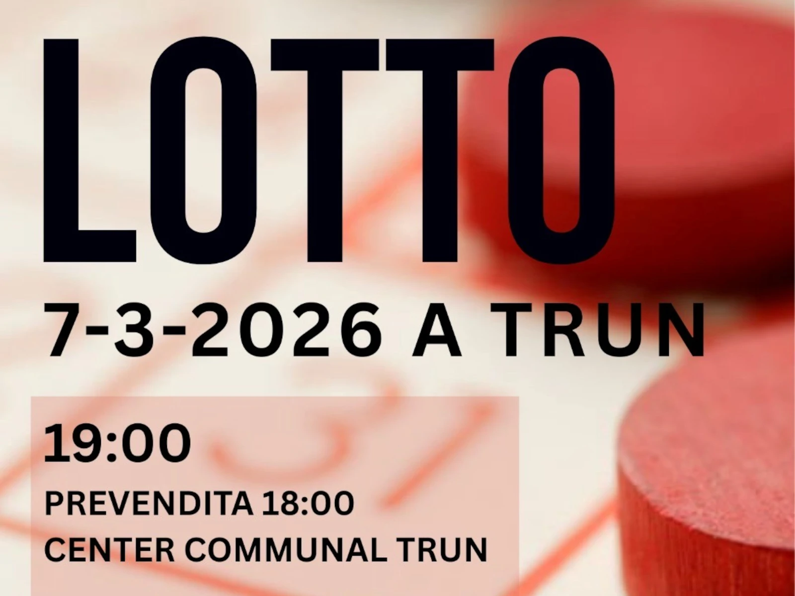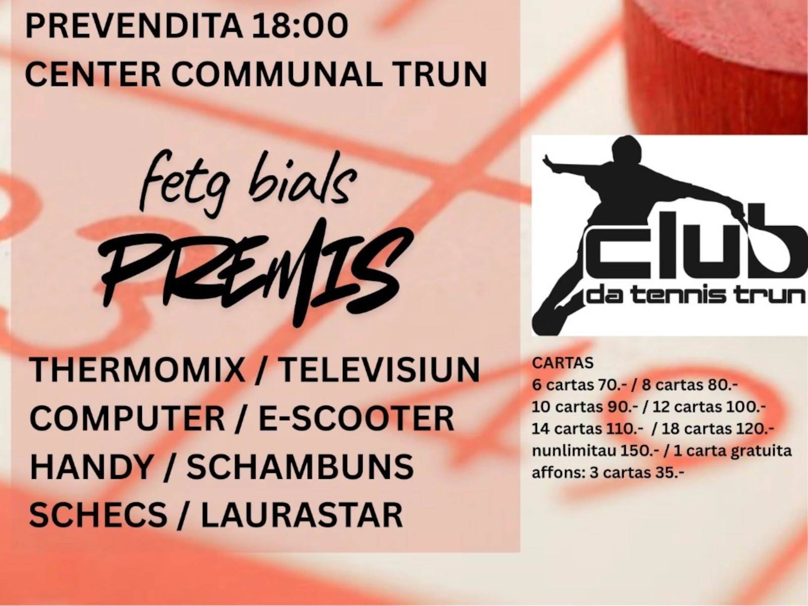 Das traditionale Lotto wird vom Tennisclub Trun organisiert. Tolle Preise erwarten Sie. Eintritt mit Vorverkauf der Lottokarten bereits um 18.00 Uhr.