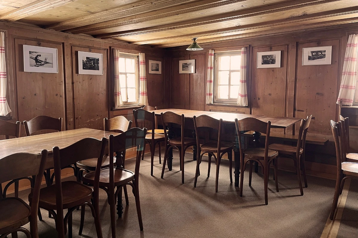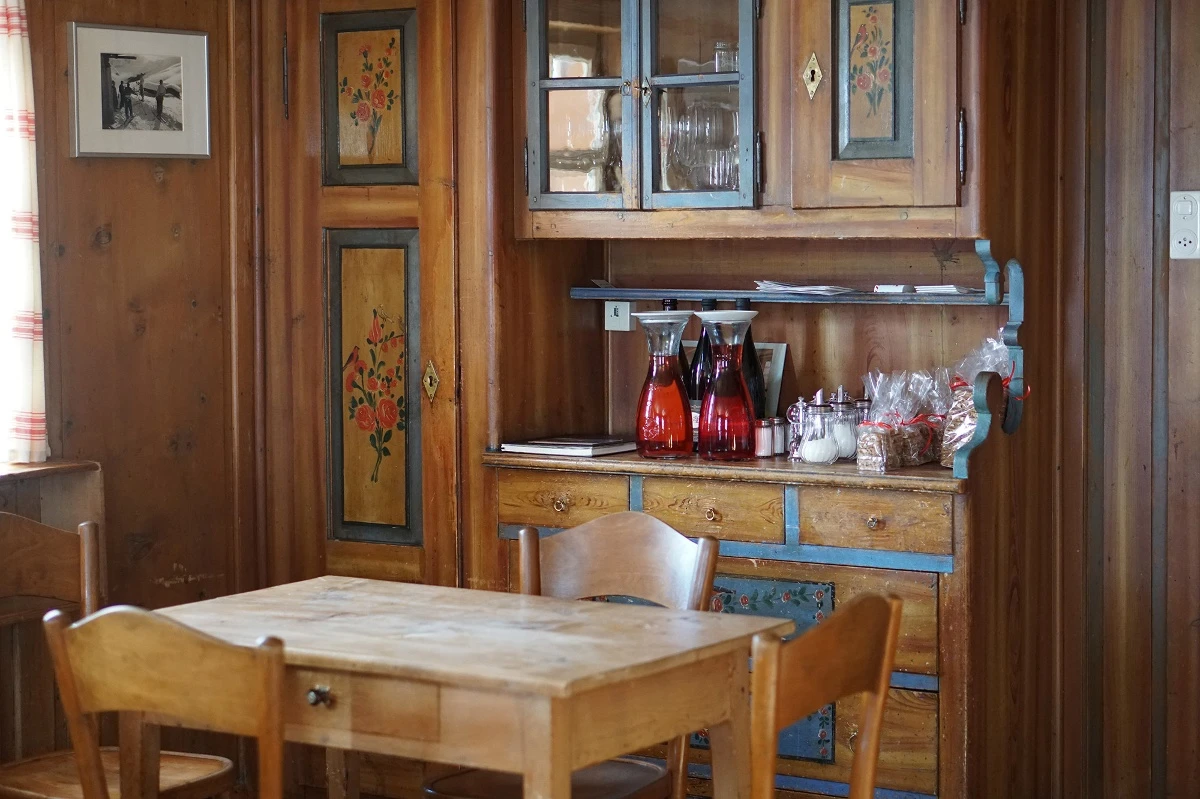 Gemütliche Gaststube und sonnige Aussenterrasse mit wunderbarer Aussichtauf das direkt gegenüberliegende Bruschghorn, den Talabschluss mit dem Weisshorn und das Tällihorn. Kehren Sie ein zu einem einfachen Mittagessen, zu Kaffee und Kuchen, zum Zvieri oder einfach um etwas zu trinken. Wir servieren u. a. hausgemachte Tagessuppen, Siedwürste, Raclette, Käse und Trockenfleisch aus Safier Produktion, hausgemachte Kuchen, Meringues, Safier Nusstorte, die besten Basler Läckerli und Safier Totenbainli sowie diverse warme und kalte Getränke, wie Camaner Quellwasser, Espresso, Kaffee, verschiedene Tees, Sirup, sowie Wein, Bier, Grappe und hausgemachten Eierkirsch. In der kalten Jahreszeit gibt es zusätzlich Kafi Lutz, Glühwein und Punsch.